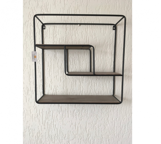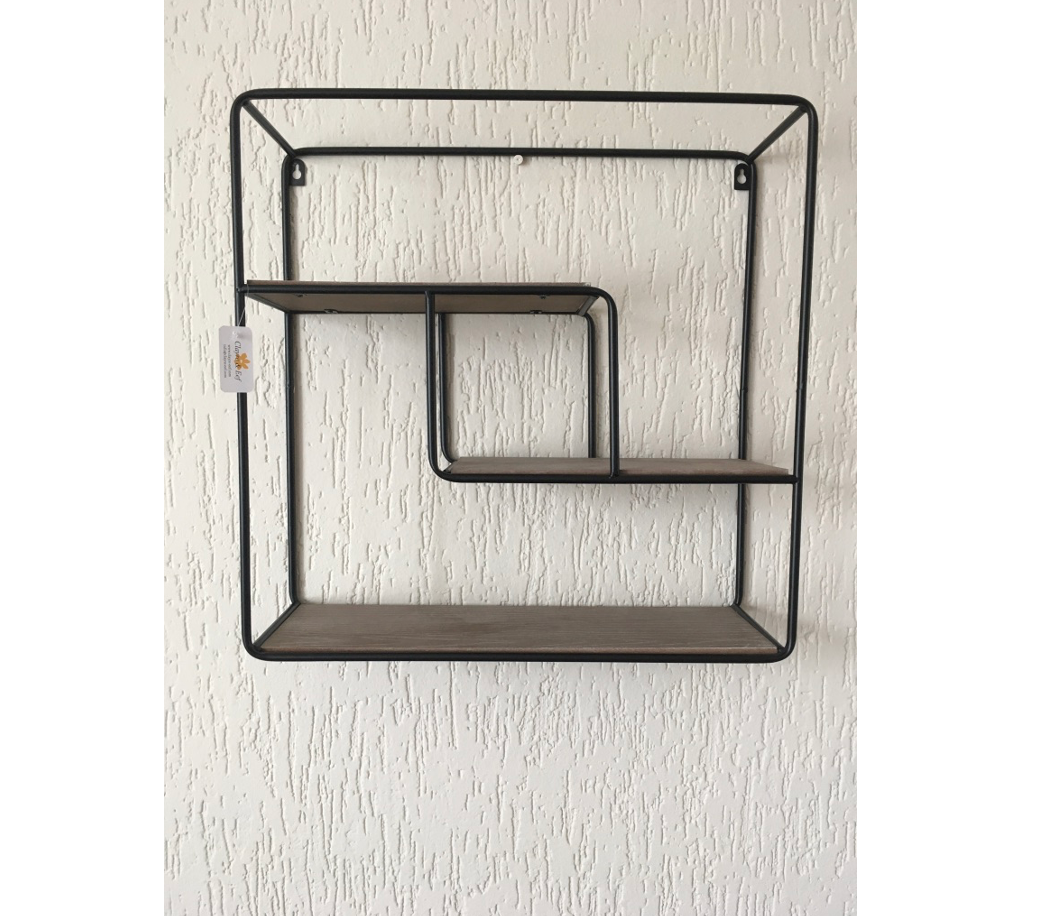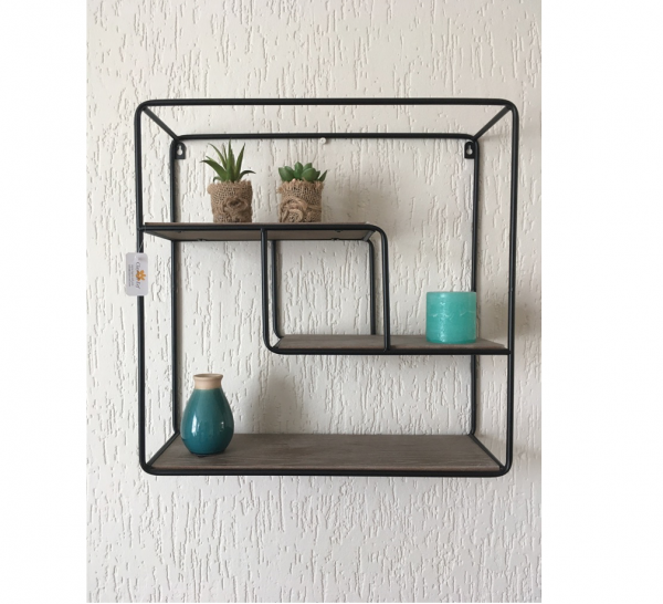 Leuk vierkant wandrek van zwart/bruin metaal met houten schappen in landelijke stijl met industriële uitstraling. Merk Clayre & Eef (5Y0792)